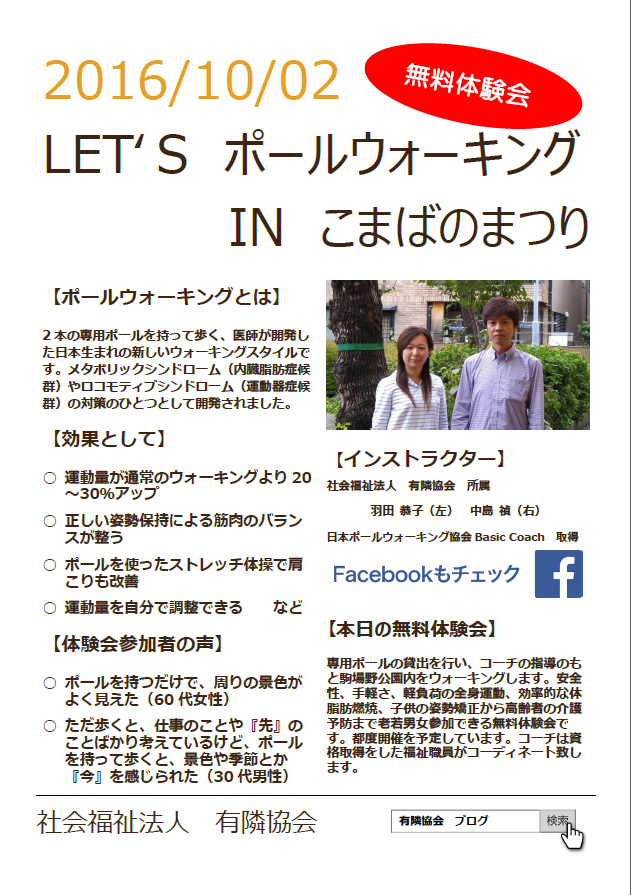 2016年10月2日(日)に、目黒区駒場の「駒場野公園で第35回こまばのまつり」が開催され、私たちは「ポールウォーキング体験会」を出展してきました。