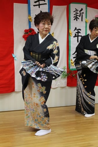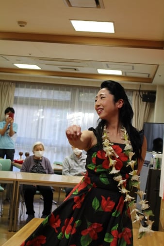 今回は、久しぶりにボランティアさんが来苑。華峰会様に依頼し、日本舞踊とフラダンスを披露していただきました。新型コロナウイルスの流行の兆しが見えていたため、華峰会様には事前にPCR検査を実施していただいています。