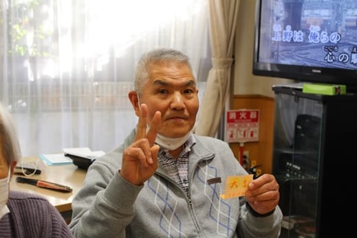 お正月と言えば初詣。初詣と言えばおみくじ。コロナ禍で初詣も行けません。「少しでもお正月気分を味わってほしい」と行事担当の加藤職員の発案で、お手製のおみくじを引きました。『大吉』を引いて笑顔があふれています。