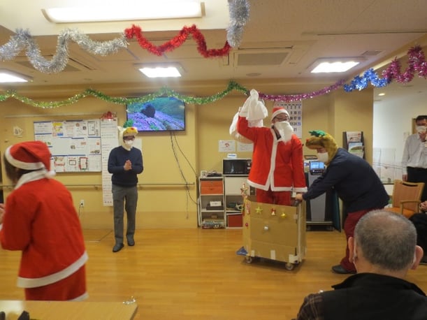 プレゼントを配る福島サンタとトナカイ子分の坂本施設長