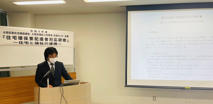 令和5年1月13日、「大田区居住支援協議会」と「大田区福祉人材育成・交流センター」が主催する庁内、関係者対象の「住宅確保要配慮者研修」に講師として登壇させていただきました。