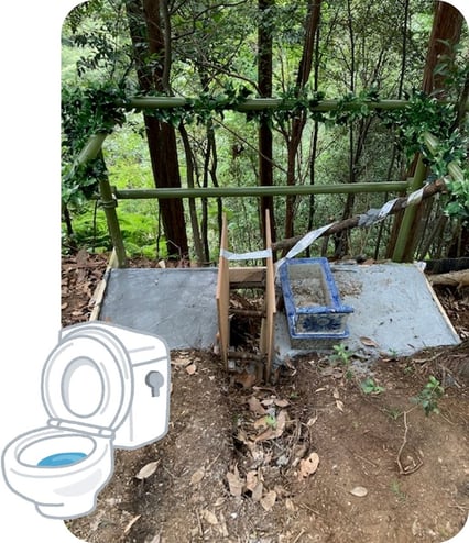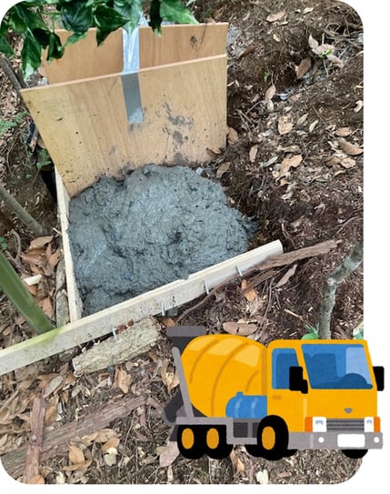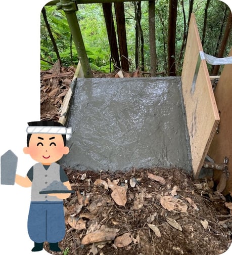 前回右足側のコンクリート打設が終了し、今回は左足側です。これが固まればいよいよ便器の設置に入れますから、完成間近ってところです。