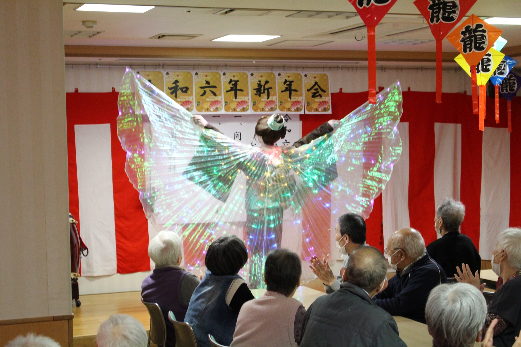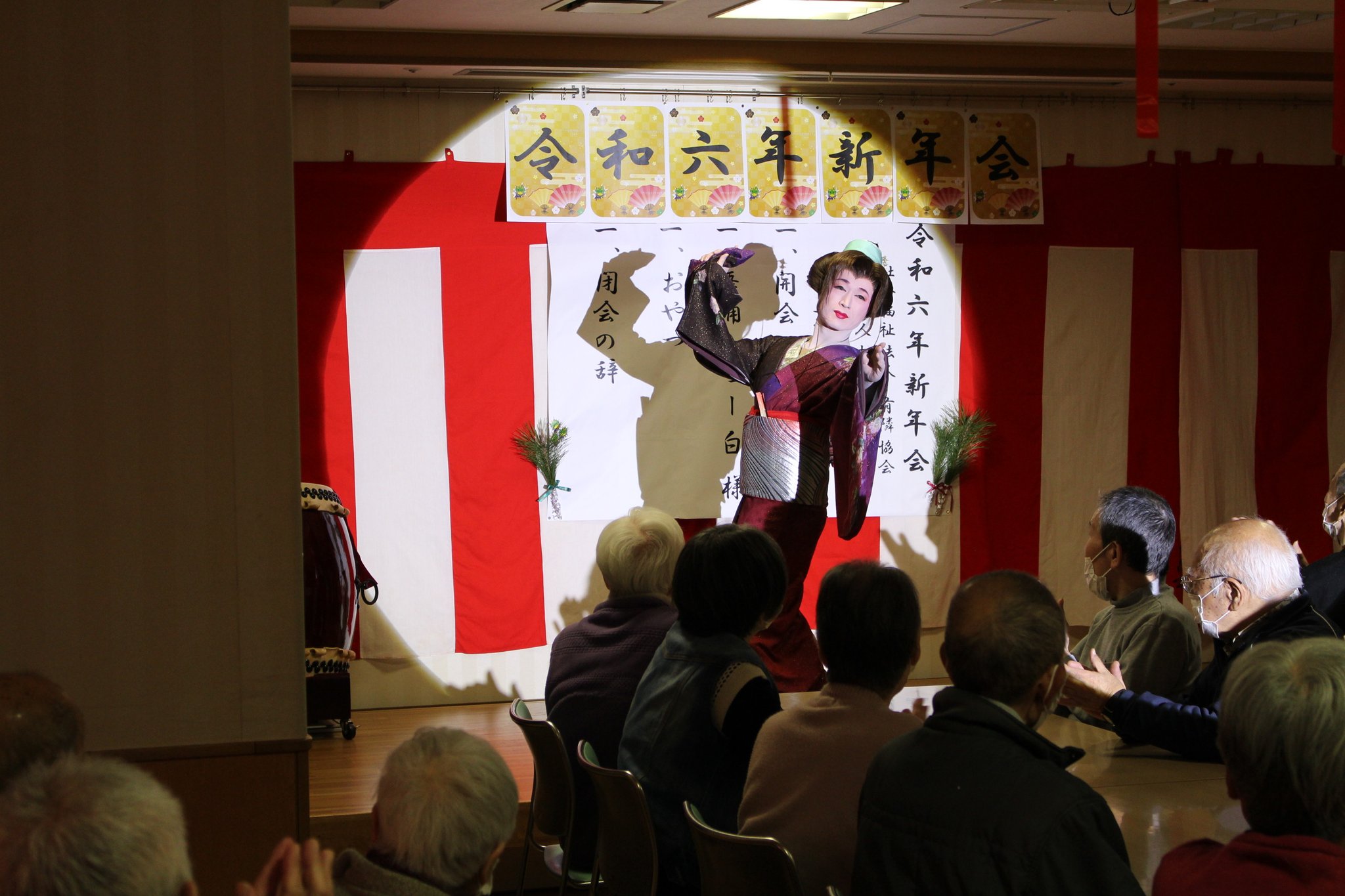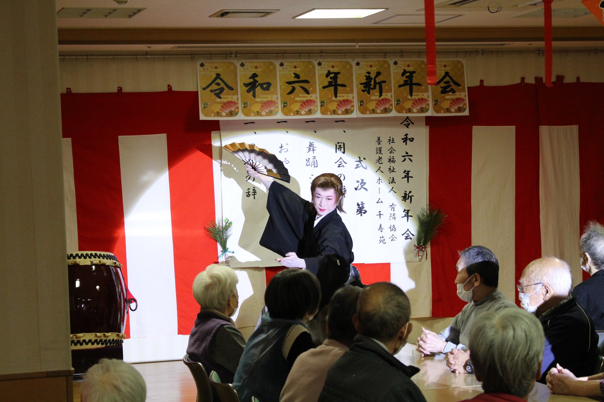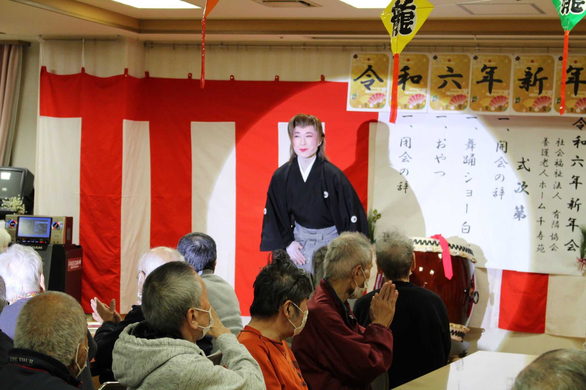 千寿苑に来て頂くのは、今回で2回目。しかも1回目は5年ほど前のこと・・。本来であれば昨年9月の敬老会に来て頂く予定だったのですが、コロナウィルス感染者が増え、直前であえなくキャンセルすることになったのでした。「今度こそ新年会を開催して、白さんに踊ってもらおう!」という決意を胸に、あれこれ準備をして何とか当日を迎えました。