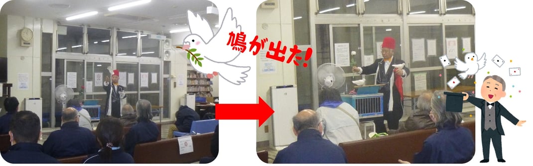 鳩出しマジックやカードマジック等が約40分開催され大いに盛り上がりました。