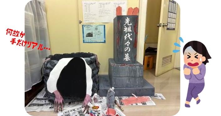 8/3(土)に東六郷老人いこいの家2階・広間にて自主事業『夏の特別企画・こわ~い映画を観て涼しくなろう!』という企画で怪談映画の観賞を行います。少しでも雰囲気を味わってもらえたらと…。職員と話し合い、ちょっとした装飾もしてみようと頑張って作ってみました!(^^)!早速、事務室に置いてある完成品を発見した利用者は、
