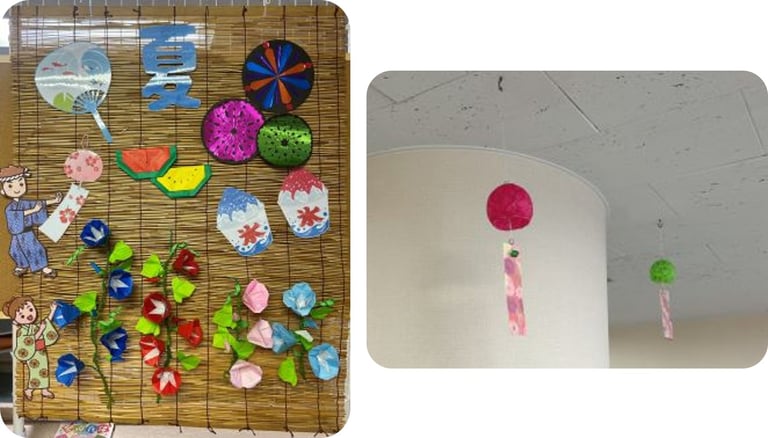夏っぽく、そしてワクワクするように!簾に折り紙で飾りを付け館内に装飾♪♪