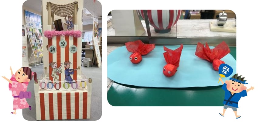 つづいて8/27(火)のオンライン交流会(納涼祭)に向けて作った櫓に金魚達!交流会当日は当日は金魚すくいゲームをしたり、櫓を囲み輪になって踊ります♪利用者は櫓を囲み輪になって踊ることを今からとても楽しみにしています。
