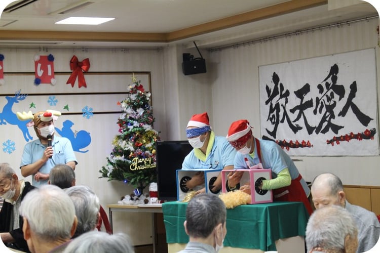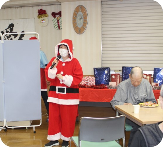 司会は千寿苑に異動して2年目の樽見生活相談員。すっかり千寿苑の“顔”となり、サンタさんの衣装で利用者さんを喜ばせてくれました。可愛いでしょ(*^^*)