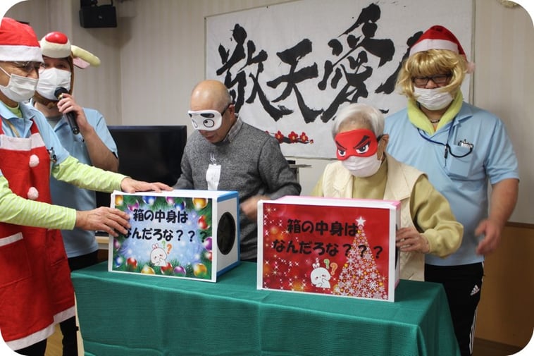 まずは、今回初めて企画した「箱の中身は何だろな?」ゲーム。担当より、職員によるデモストレーションを依頼。確かに「盛り上げてね」とは言っておいたけど・・・・・あまりのオーバーアクションで箱をぶっ壊してしまいました💦