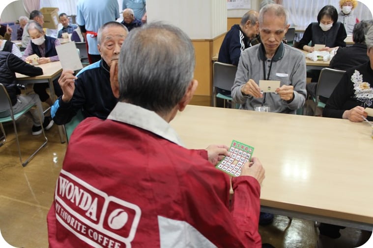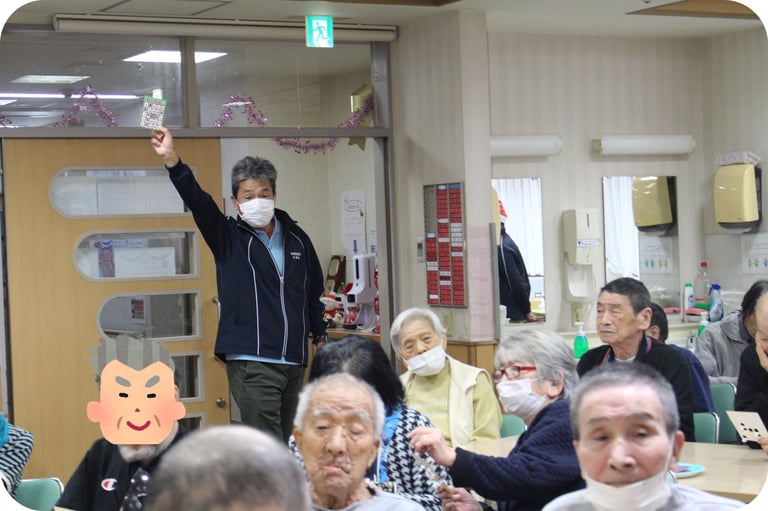 ゲーム開始早々に、利用者さんの後ろのほうから、元気よく「ビンゴ!」と手を挙げたのは、なんと!施設長💦