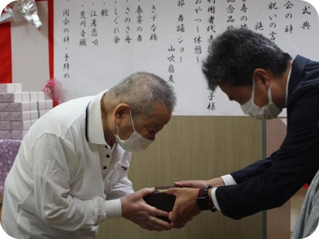 式典は続いて、大月施設長による挨拶と記念品授与の様子です。