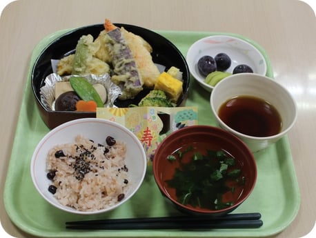 メニューは、敬老のお祝いとあってお赤飯と、天ぷらの盛り合わせです。特に海老と穴子の天ぷらが大好評でした。