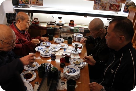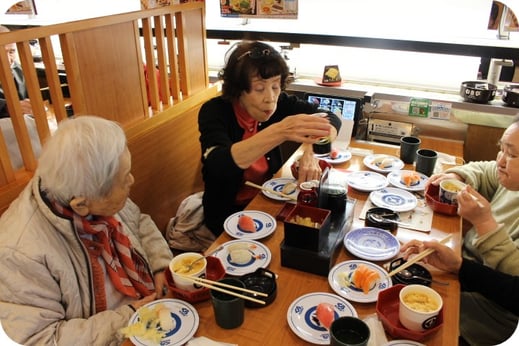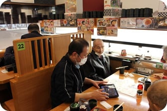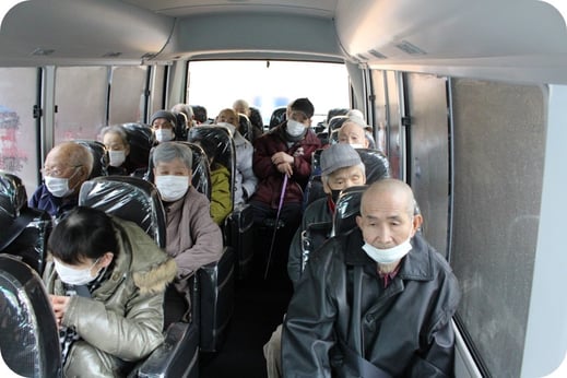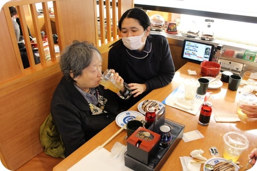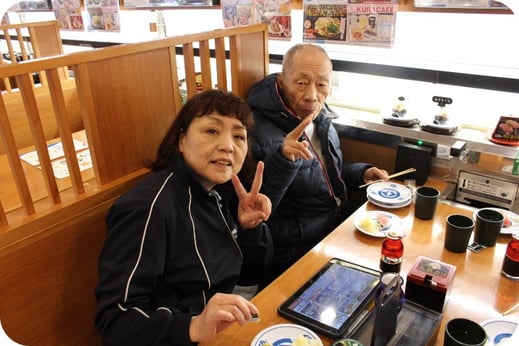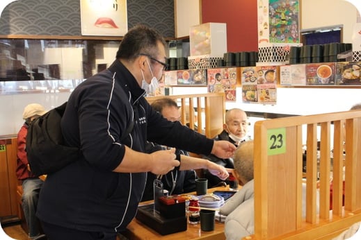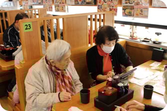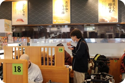 事前のアンケートを基に今回のメニューはお寿司。参加者は19名。向かった先は千寿苑からも程近いララテラスの「くら寿司」です。移動の手段はマイクロバス。近場とはいえ、日常とは違う出来事に皆ウキウキとキンチョーの車中。