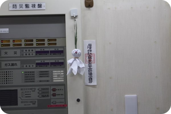 ビール工場見学の日は強風、今回は前日夜から降雪の予報が…。「中止かなぁ」と不安がよぎる中、「てるてる坊主を作ろう」と鈴木主任の声が。千寿苑の氏神様である石浜神社のお札の横に願いを込めたてるてる坊主を飾ることに。