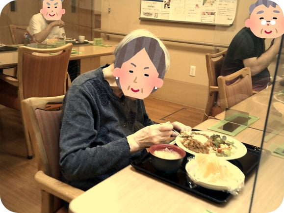 朝9:30。館内放送をする前からマイエプロン・三角巾を身にまとった利用者数名が食堂に集結。放送でお手伝いを要請するとさらに数名集まり、作業開始。野菜を切る利用者、肉を炒める職員、みんな真剣ゆえに無言。食堂に包丁の音と、肉を炒める音だけが響きます。。。