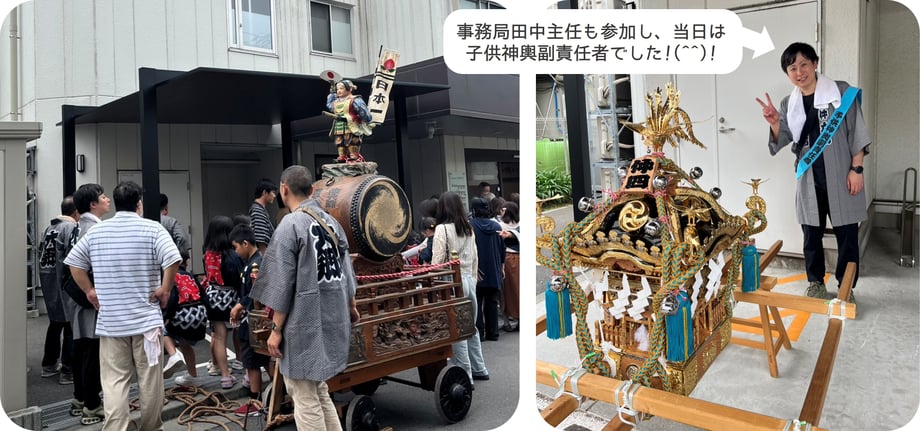一方、子供神輿も負けてはいません!(*^^)v 華やかな装飾と元気な掛け声で、大人顔負けの盛り上がりを見せていました。そして、今年は、法人本部建物に新しく設置した駐輪場を活用して、子供神輿の休憩所として初めてご提供することができました。