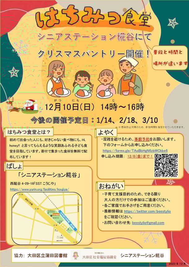 みなさんこんにちは。 シニアステーション糀谷です。 もうすっかりクリスマス☆彡 SST糀谷では子ども食堂とのコラボ企画「クリスマスパントリー」を開催しました。 (昨年の様子はこちら⇒https://www.yurin.org/blog-20231219-koujiya/)