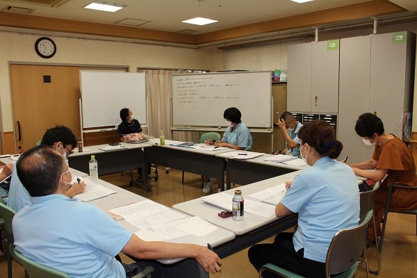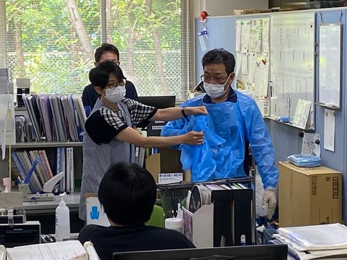 最近は暦通りに、秋の気配を感じる日々が続いております。この季節の変わり目は体調を崩すことが多いです。養護老人ホーム千寿苑は高齢者が生活していますので、職員は利用者と自分自身を守らなければなりません。さらに去年から続いている新型コロナウイルス感染症の猛威が未だに収まりません。これまでの感染症予防に加え、新型コロナウイルスに対する感染予防も必要です。そこで千寿苑の伊藤看護師がこれまでの復習と新たな技術を習得するために感染症予防研修を開催しました。 伊藤看護師の考えは、「こちらから伝えるのみの研修は行いたくない」「職員がワクワク楽しめる研修にしたい」「間違っていることがあれば、私が直す」ということをテーマに熊谷主任支援員と鈴木生活相談員で話し合いを行い、当日を迎えました。