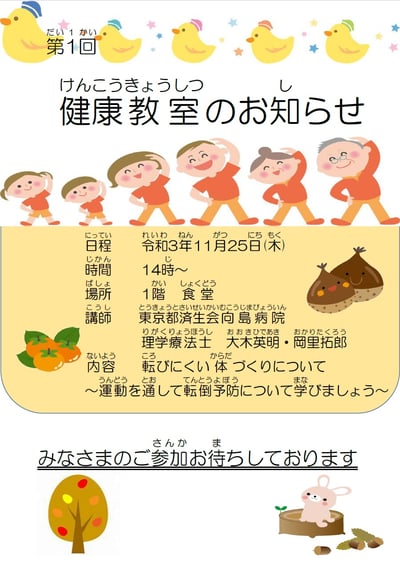 協力病院である済生会向島病院から「健康体操」のご提案がありました。ポスターも済生会向島病院で作成していただきました。