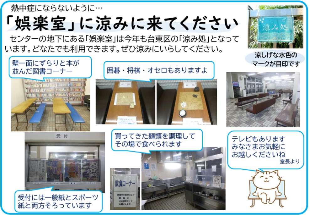 今年も猛暑日が続き、外は大変な暑さになっています。 娯楽室では、城北労働・福祉センターの「ひろば」に、利用者や近隣に暮らす方たちに少しでも涼しい場所の提供ができればという思いで、以下の記事を掲載させていただきました。