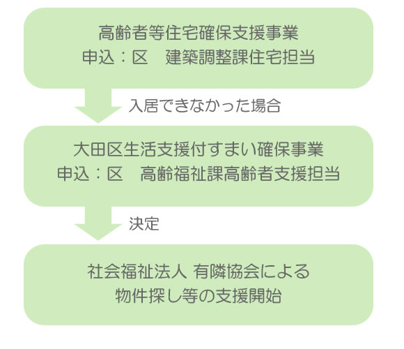大田区まちづくり推進部建築調整課にて実施している「高齢者等住宅確保支援事業」で民間賃貸住宅の入居契約が出来なかった高齢者世帯(区内に直近1年以上居住している65歳以上の単身世帯又は65歳以上と60歳以上の者で構成される夫婦世帯等)